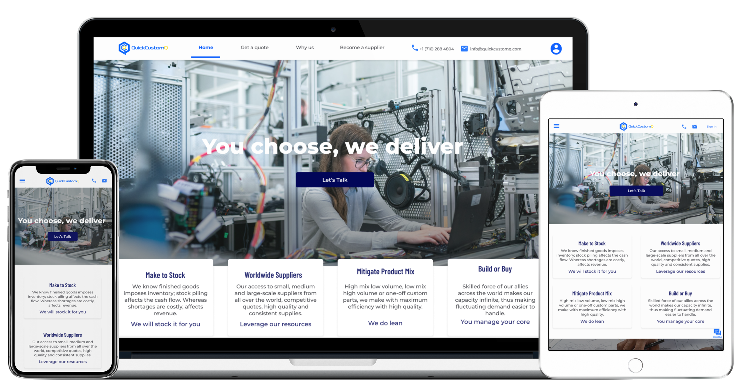 The Quick Custom Q website is responsive and works for mobile, tablet and desktop devices. All breakpoints have four cards containing text with moving animation behind them creating an accessibility problem. The website uses one image twice on the same page with other images placed over it. The tablet breakpoint lacks margins and in places, has poor padding between UI elements. The desktop side navigation isn't well suited to this breakpoint.